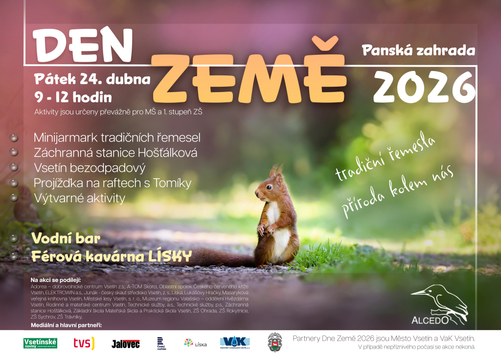 Oslavu Dne Země s programem pro děti z mateřských škol a žáky základních škol připravujeme na pátek 24. dubna 2026 od 9 do 12 hodin v Panské zahradě. Společně s dalšími vsetínskými organizacemi, které se na programu podílejí, se budeme učit poznávat naši přírodu, vnímat ji všemi smysly, seznamovat se s tradičními řemesly a jezdit na raftech s Tomíky. Účast přislíbila také Kamila Křupalová se svými zvířecími svěřenci ze Záchranné stanice v Hošťálkové.